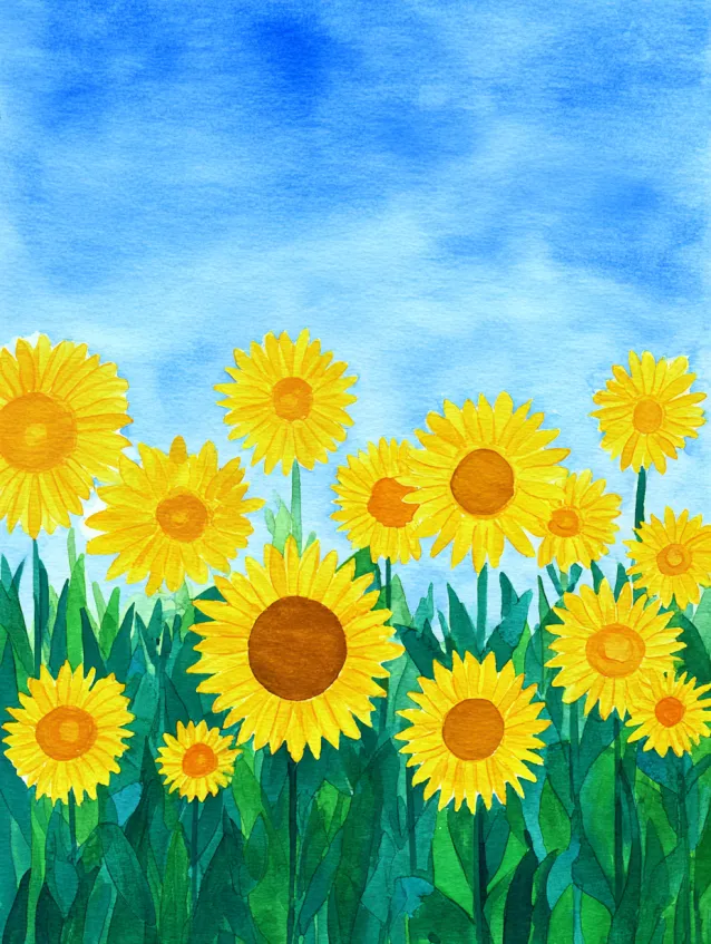 This watercolor painting is filled with bright yellow sunflowers stretching toward a soft blue sky. The flowers have simple round centers and bold petals that pop against lush green stems. The layout feels full and joyful, with blooms clustered in the foreground for depth. The sky wash in the background keeps everything light and fresh.