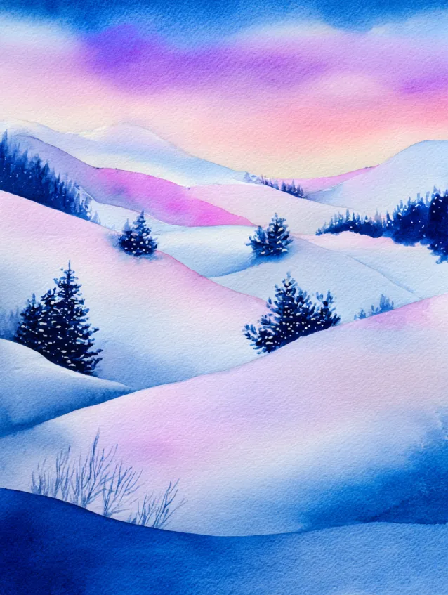 This watercolor painting features gentle rolling snow covered hills fading into the distance under a dreamy pastel sky. The sky melts from soft pink to lavender and pale blue, while tiny evergreen trees dot the slopes for subtle detail. The smooth shading on the hills creates depth, yet the shapes remain simple and rounded. The whole composition feels calm, airy, and balanced with soft transitions between colors.