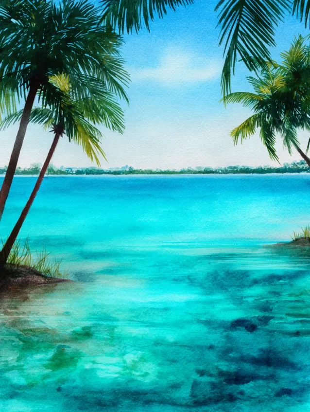 This watercolor painting shows a crystal clear turquoise lagoon framed by tall palm trees leaning gently toward the water. The horizon line is soft and distant, while the foreground water shimmers in layered shades of aqua and teal. The palm trees are painted with loose, expressive strokes, and the sky glows in fresh blue tones. The composition feels open and breezy, instantly transporting you to a sunny island escape.