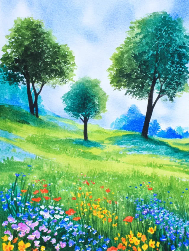 This watercolor painting showcases a sunny green meadow dotted with colorful wildflowers and a few tall leafy trees. The foreground is sprinkled with tiny pops of purple, yellow, and pink blossoms, while the background fades into soft blue hills. The brushwork is gentle and layered, creating depth without heavy detail. The layout feels balanced, with the trees drawing the eye upward and the flowers grounding the scene.