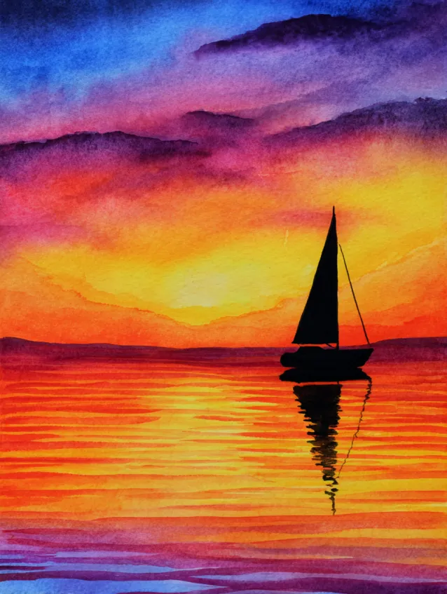 This watercolor painting features a bold sunset sky glowing in intense shades of orange, red, and magenta. A dark sailboat silhouette sits calmly on reflective water, with the warm colors mirrored below. The gradient sky blends smoothly from bright yellow near the horizon to deeper tones above. The strong contrast between the dark boat and the luminous background creates a striking focal point.