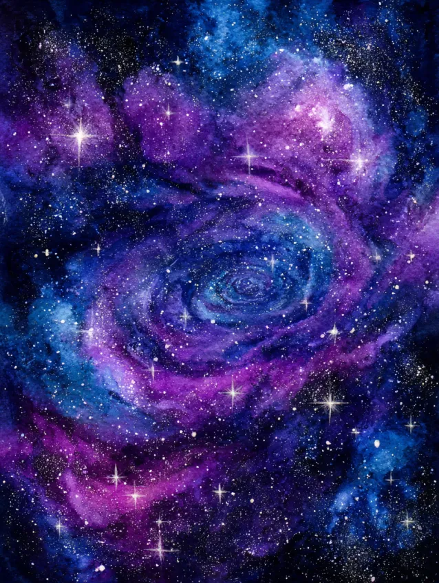 This watercolor painting captures a mesmerizing galaxy filled with swirling purples, blues, and hints of bright pink. Tiny white stars are scattered across the cosmic spiral, adding sparkle and depth. The composition centers around the glowing swirl, with darker outer edges that frame the scene beautifully. The layered washes give the galaxy movement and mystery without complicated details.