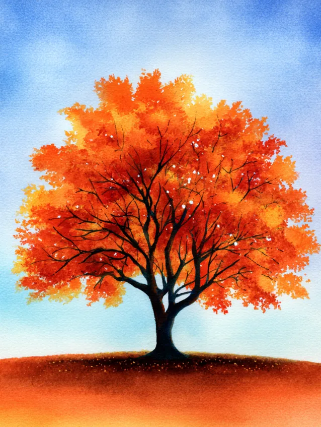 This watercolor painting highlights a single tree bursting with fiery orange leaves against a soft blue sky. The tree trunk and branches are dark and slightly textured, while the leaves are created with dabbing strokes that form a full, rounded canopy. The ground beneath is warm and earthy, anchoring the composition. The contrast between the bright foliage and the calm sky makes the design pop beautifully.
