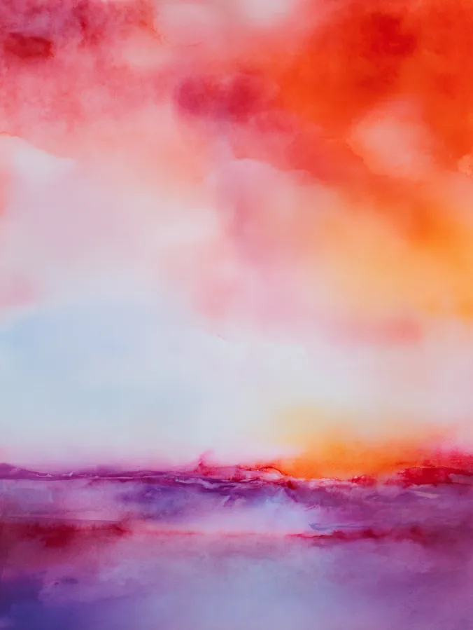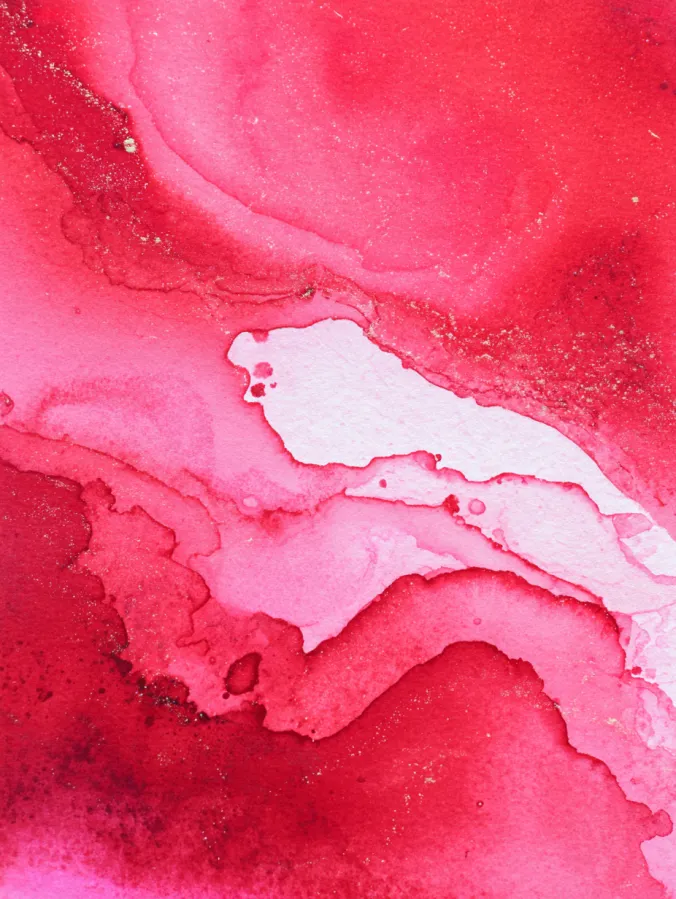 This watercolor design features rich red and rosy pink pigments melting into each other in smooth, organic layers. The composition feels fluid and natural, with soft edges, blooming transitions, and visible water textures that create a sense of movement across the page. Lighter areas break through the deeper reds, giving the painting breathing room and a beautiful contrast that keeps the eye wandering. The overall layout feels loose yet balanced, like the paint was allowed to do its own thing while still landing exactly where it needed to.