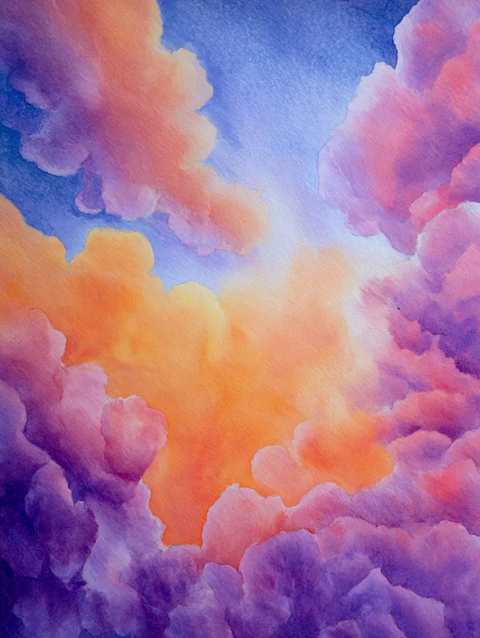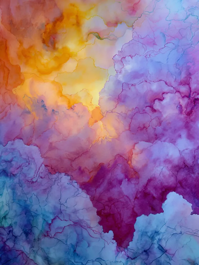 This watercolor piece feels like a dreamy cloudscape made of glowing color. Warm yellows and peach tones melt gently into purples pinks and cool blues with soft organic edges throughout. The brushwork looks fluid and layered with pigments spreading naturally and creating delicate vein like textures where colors meet. The composition fills the page with no hard focal point which makes the whole painting feel airy balanced and calm while still being visually rich.