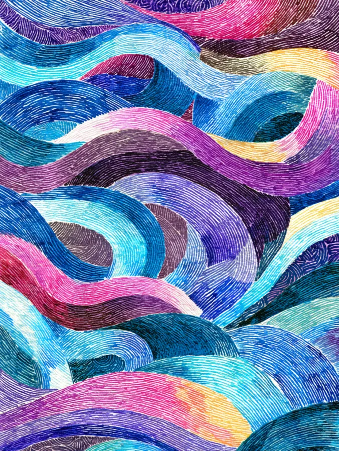 This watercolor design is filled with flowing wave shapes layered across the page in rich blues teals purples pinks and soft golden tones. Each shape is built with fine repeated brush strokes that follow the curve of the form which adds texture and rhythm to the piece. The overlapping waves create depth while the color shifts keep everything lively and balanced. The overall layout feels energetic but organized like movement frozen in a playful pattern.