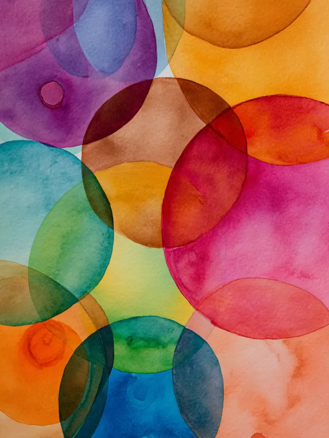 This watercolor painting features overlapping translucent circles in bright cheerful shades of pink orange yellow green blue and purple. Each shape softly blends where it overlaps with the next creating new colors and gentle transitions. The brushwork is smooth and even with visible watercolor texture that keeps the circles from feeling flat. The overall composition feels playful and balanced with shapes spread across the page in a way that feels spontaneous yet visually satisfying.