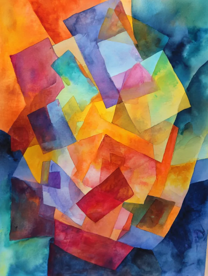 This watercolor painting is made up of overlapping geometric shapes painted in warm oranges reds yellows and soft cool blues. Each shape is filled with loose transparent washes that overlap and blend creating new colors where they meet. The brush strokes feel relaxed and organic which keeps the shapes from looking too rigid. The overall layout feels playful and balanced with movement flowing through the center and darker edges gently framing the composition.