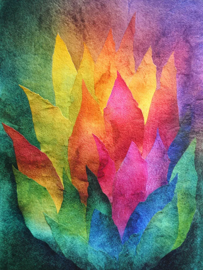 This watercolor painting shows pointed leaf like shapes layered upward in a loose clustered arrangement. Bright pinks yellows oranges greens and blues overlap softly with translucent washes that let each layer glow through the next. The edges feel organic and slightly uneven which keeps the shapes natural and relaxed. The darker background gently frames the center making the colors pop while the overall layout feels balanced and calm.