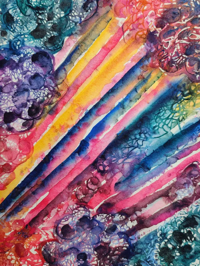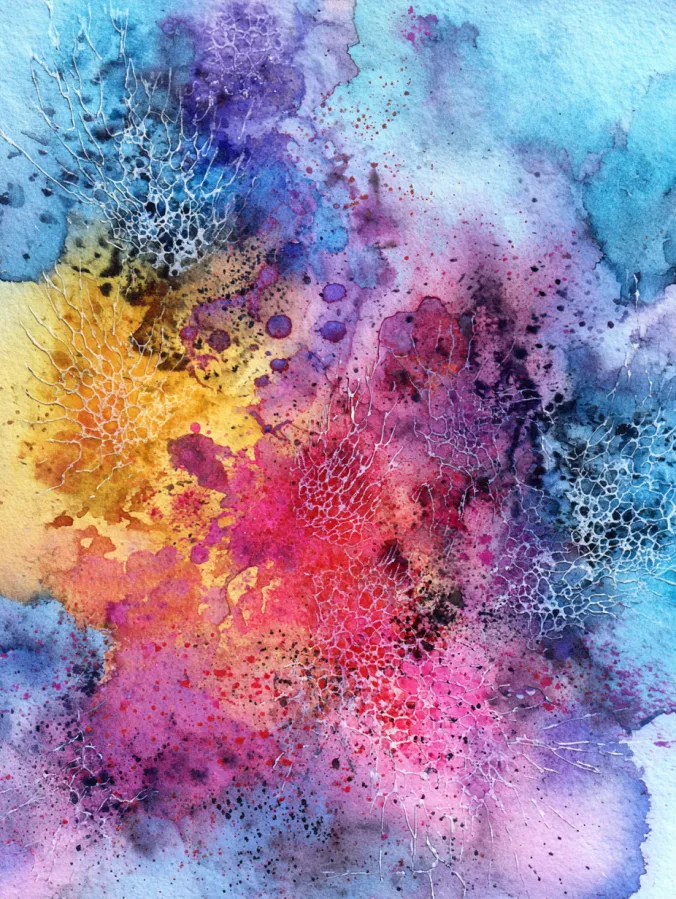 This watercolor piece is bursting with layered color and organic texture that feels wild in the best way. Soft blues and purples blend into bold pinks reds and warm yellows while splatters and blooms scatter naturally across the surface. Delicate web like textures appear in places where pigment has separated and dried creating a crackled effect that adds so much visual interest. The composition feels free and energetic with no strict structure which makes the whole painting feel alive and spontaneous.