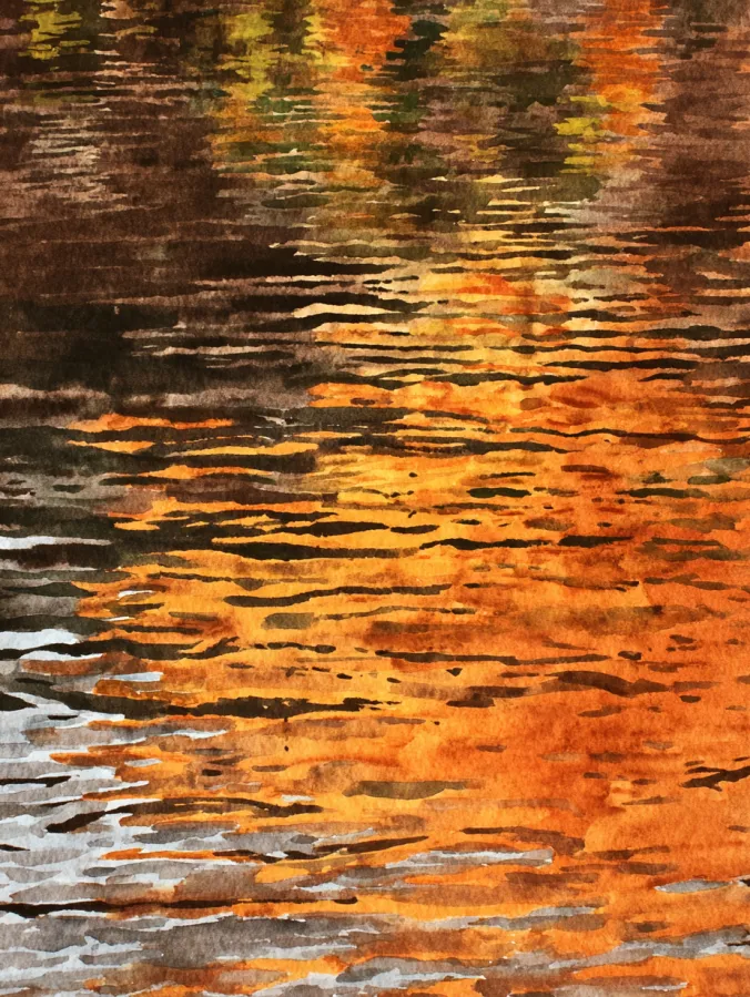 This watercolor piece captures shimmering water reflections in warm autumn shades of burnt orange gold deep brown and soft gray. The brush strokes run mostly horizontal which instantly gives that rippling water effect and makes the surface feel alive. Layers of transparent color sit on top of each other creating depth while darker streaks break things up and add contrast. The overall layout feels loose and flowing yet intentional with enough variation to keep the eye moving across the painting.