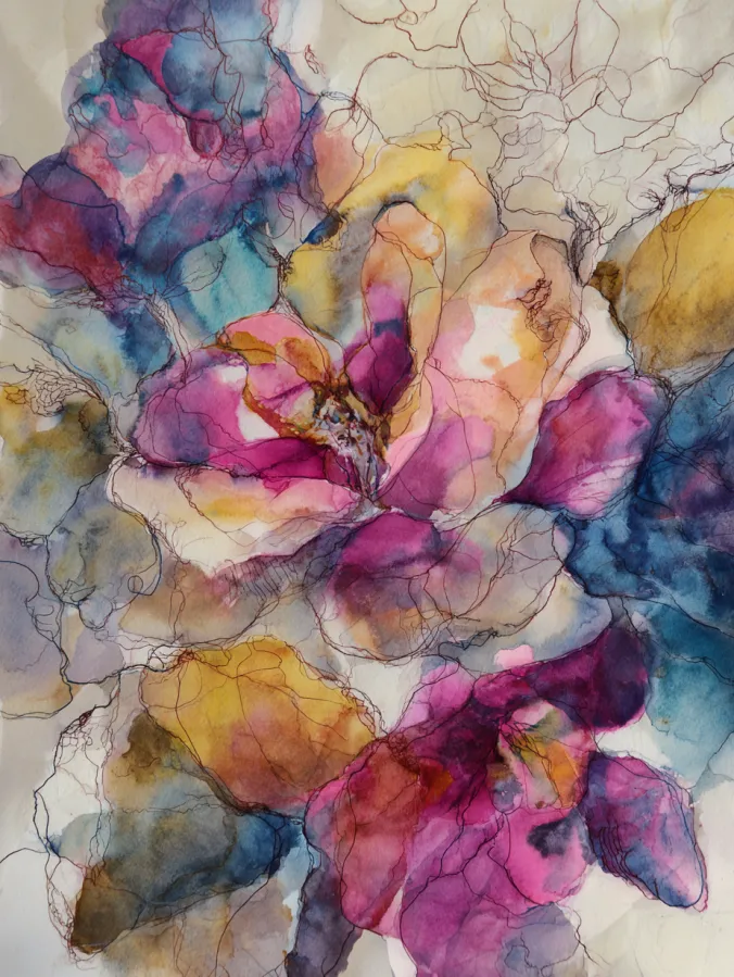 This watercolor artwork blends soft flowing color with delicate sketchy line work to create an expressive floral design. Layers of pink magenta warm gold and cool blue washes overlap gently while thin organic lines trace petals and shapes throughout the composition. The flowers feel loose and dreamy rather than precise with colors bleeding naturally into one another and leaving airy spaces that keep the layout balanced and light. The overall look feels energetic yet graceful like the flowers are unfolding right on the page.