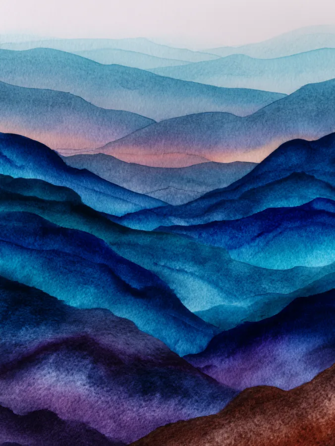 This watercolor painting shows softly stacked mountain shapes fading into the distance in calm shades of blue teal violet and a hint of warm blush near the horizon. Each layer is painted with gentle washes and smooth transitions creating a sense of depth without sharp edges. The brush strokes are loose and fluid letting the colors blend naturally while still keeping each ridge distinct. The overall composition flows from dark foreground layers into lighter misty shapes in the background which makes the scene feel peaceful and spacious.