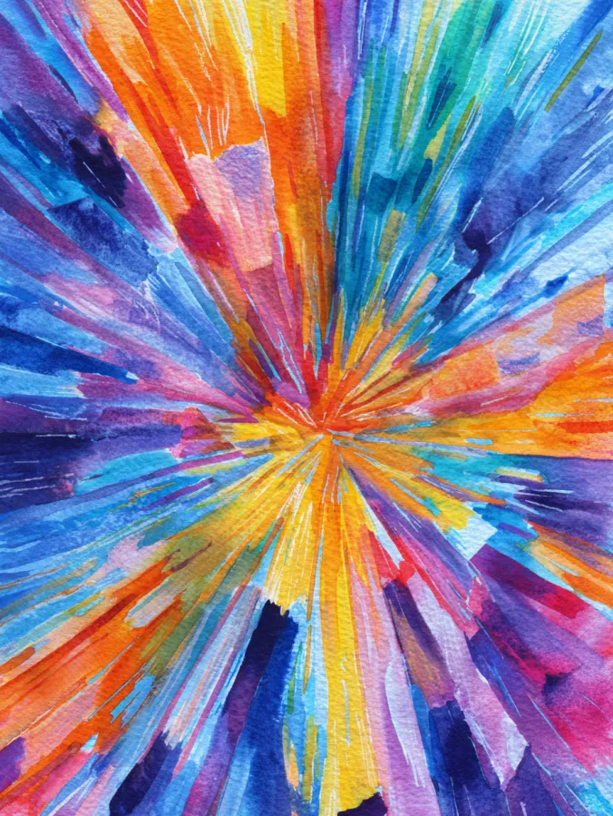 This watercolor painting explodes with bold energetic color shooting outward from the center in long confident strokes. Bright yellows oranges blues pinks and purples overlap and blend while still keeping their own personality. The brushwork feels fast and intentional with visible streaks that create movement and direction across the page. Everything radiates from one focal point which gives the whole piece a powerful sense of flow and makes the composition feel alive and playful at the same time.