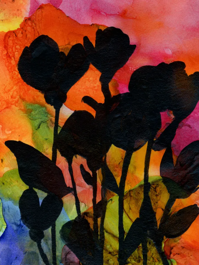 This watercolor painting combines striking black floral silhouettes with a glowing background of blended pink orange yellow green and blue washes. The flowers stand tall with soft organic edges while the background colors bleed and bloom into each other creating a rich layered look. Brush strokes feel loose and confident especially in the background where the paint flows freely. The strong contrast between dark shapes and vibrant color gives the whole composition drama and visual punch without feeling crowded.