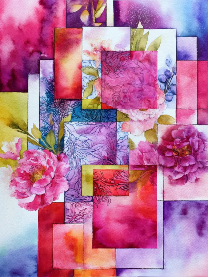 This watercolor design mixes soft florals with stacked geometric blocks in a playful layered layout. Warm pinks reds purples and golden yellows blend gently inside rectangular shapes while delicate floral line work and loose blooms peek through underneath. The brush strokes vary from smooth washes to textured edges which adds depth and keeps the composition interesting. Everything overlaps in a way that feels intentional but still relaxed like pieces coming together naturally rather than perfectly aligned.