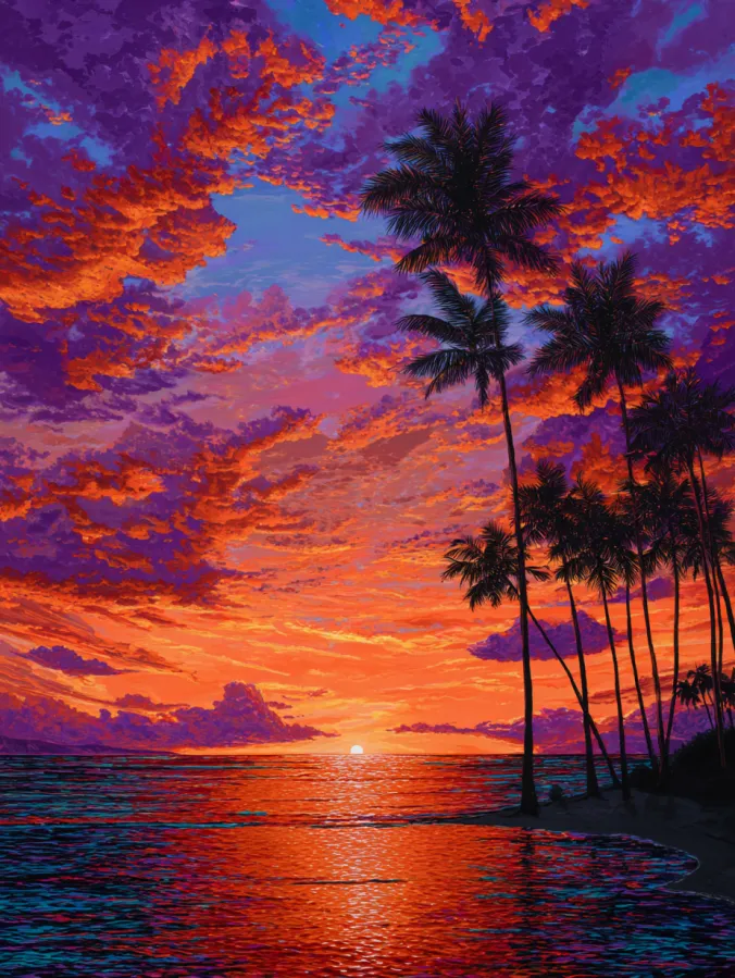 This kind of sunset scene is honestly one of my favorite things to paint. The colors are bold and playful, so it feels like pure freedom on the canvas. I love experimenting with bright oranges and purples and letting them blend together in soft glowing layers. The palm trees add a fun contrast since they are simple dark shapes that instantly make the painting look dramatic. It is relaxing, a little dreamy, and the final result looks amazing hanging on a wall when you want a warm tropical mood in the room.