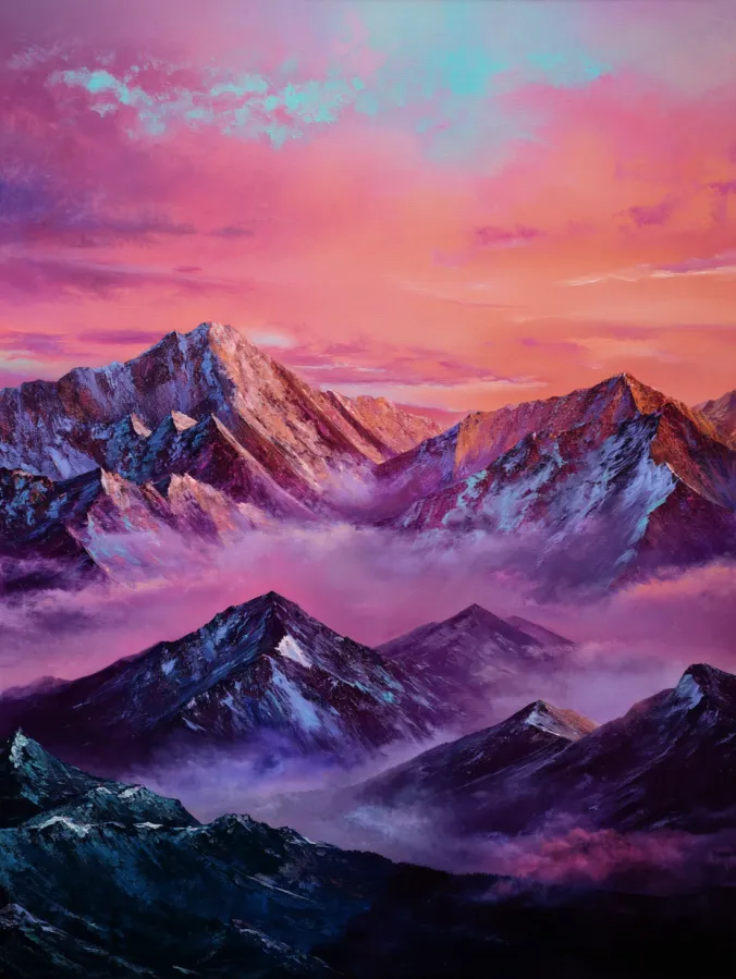 This acrylic painting captures a breathtaking mountain range glowing under a soft sunset sky. Jagged snowy peaks rise high above layers of mist that drift through the valleys below. The mountains are painted with deep indigo, plum, and cool slate tones that contrast beautifully against the warm sky. Above them, the sunset glows with gentle shades of peach, rose pink, and lavender that blend smoothly across the clouds. Soft brush strokes create the fog rolling between the peaks, giving the whole scene a dreamy atmosphere that feels calm and expansive.