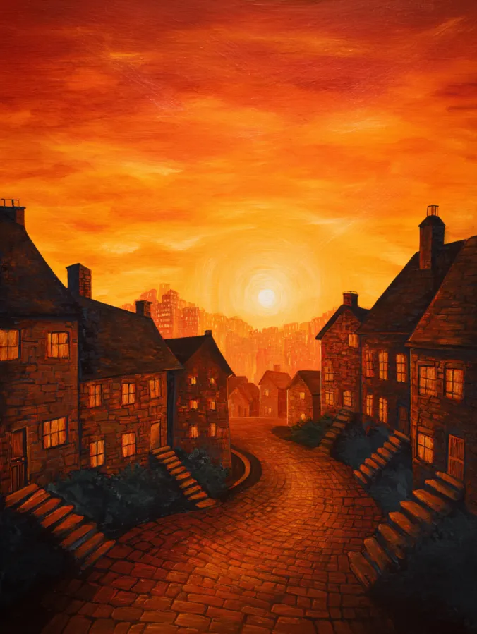 This acrylic painting shows a charming village street bathed in a rich glowing sunset. A curved cobblestone road winds gently through a row of rustic stone houses that line both sides of the scene. The windows glow warmly as if evening lights have just been turned on inside. Above the rooftops the sky blazes with deep orange and golden sunset tones that slowly fade into softer amber clouds. The bright sun rests low above the distant city skyline and casts warm light across the road and buildings. Textured brush strokes add life to the cobblestones and walls which gives the whole painting a cozy storybook atmosphere.