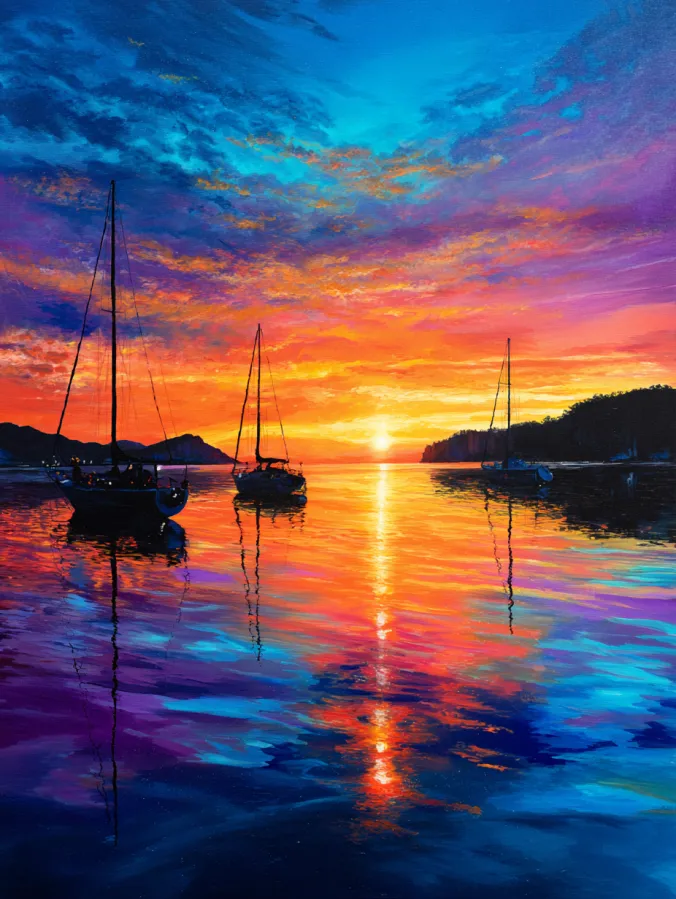This acrylic painting shows a peaceful bay glowing under a vibrant sunset sky. The sun sits low near the horizon and spreads warm golden light across the water. The sky above bursts with rich colors that blend from fiery orange and coral near the sun into soft purples and cool turquoise blues higher in the clouds. Three sailboats float quietly on the calm water with their tall masts reflected in the colorful surface below. Gentle ripples catch the sunset light and scatter glowing reflections of pink, gold, and deep blue across the bay.
