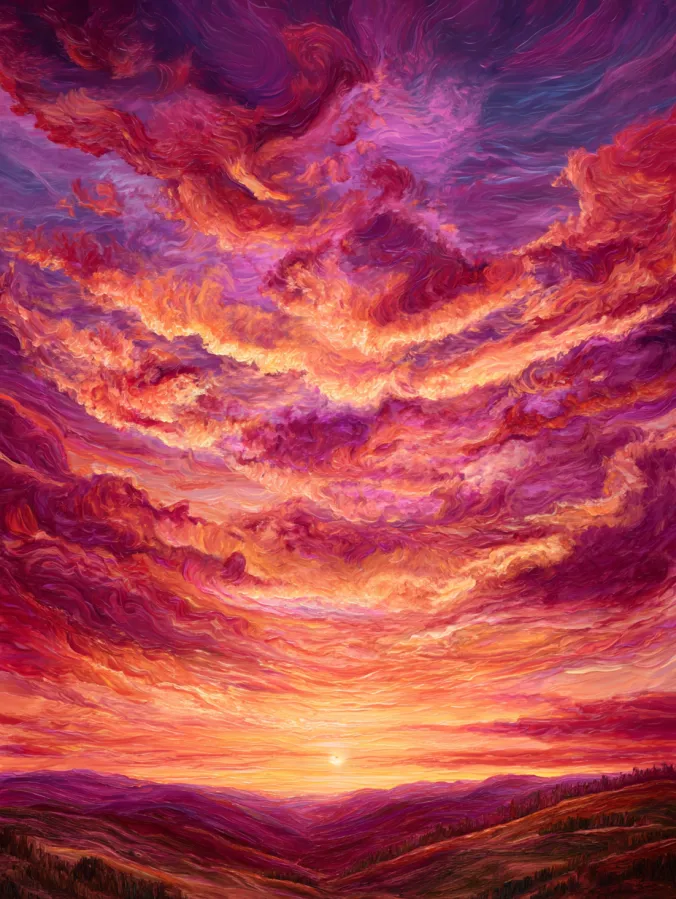 This acrylic painting bursts with dramatic movement and glowing color across a wide sunset sky. Thick swirling clouds stretch across the canvas in glowing layers of coral, magenta, rose, and fiery orange. The brush strokes curve and twist through the clouds which gives the sky a soft flowing energy that feels almost alive. Below the glowing sky, gentle hills roll across the landscape in deep plum and violet shadows. The sun rests low on the horizon and spreads warm golden light through the valley which adds a soft glow beneath the vibrant cloud layers.