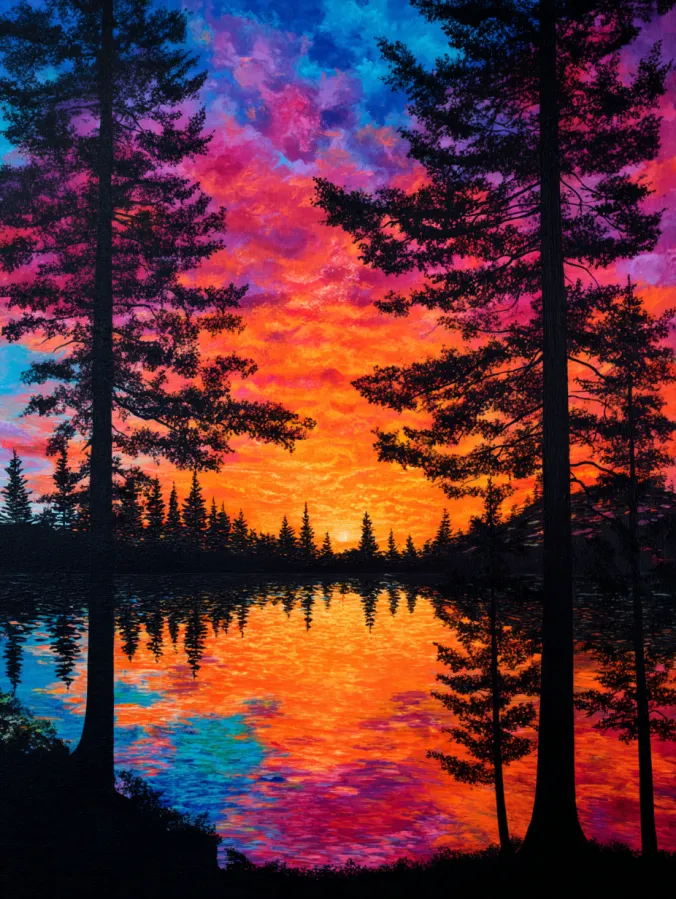 This acrylic painting captures a peaceful forest lake glowing with intense sunset colors. Tall pine trees stand in dark silhouettes along the shoreline and frame the scene on both sides of the canvas. Across the water, a line of distant evergreens stretches along the horizon. The sky above bursts with brilliant shades of orange, coral, magenta, and deep blue clouds that spread across the evening sky. Those fiery colors reflect across the lake like a mirror, creating glowing streaks of red, pink, and gold rippling through the water.
