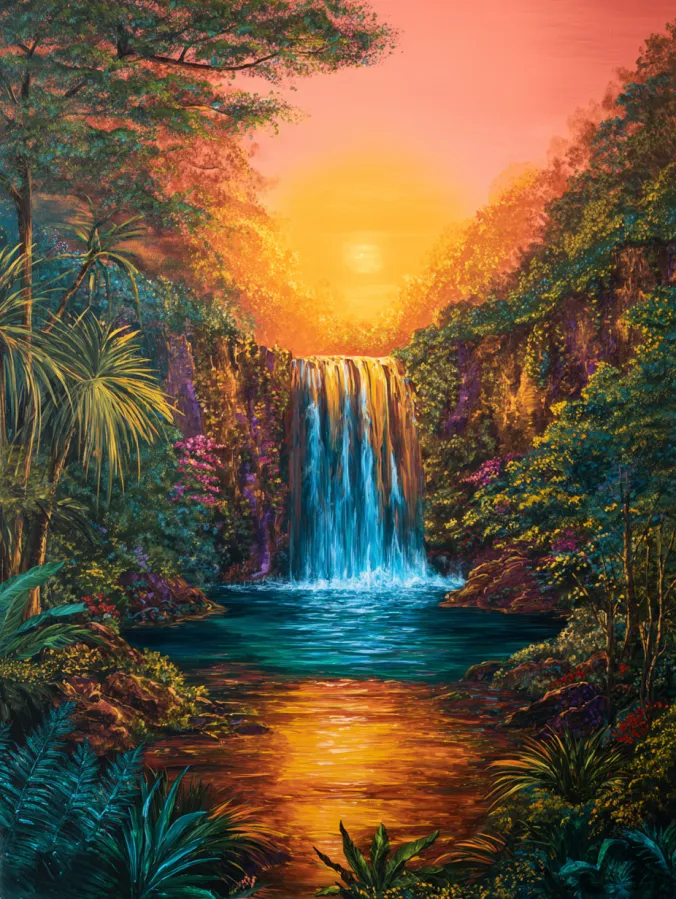 This acrylic painting captures a lush jungle waterfall glowing under a warm sunset sky. Golden light fills the background where the sun sits low above the treetops, casting a soft glow across the entire scene. A waterfall spills down a rocky cliff into a calm turquoise pool, its flowing water painted with smooth layered strokes that create gentle motion. Surrounding the waterfall is a dense jungle full of deep green leaves, colorful flowers, and rich foliage that frames the glowing center of the composition. The warm sunset light reflects across the water in shimmering shades of gold and amber.