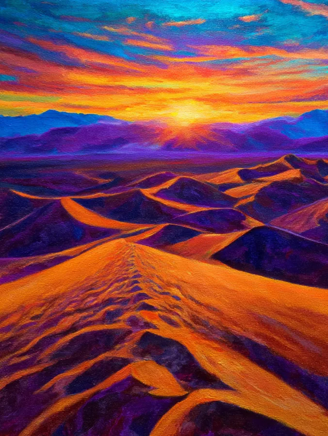 I always find desert scenes like this surprisingly relaxing to paint. The dunes create flowing shapes that naturally guide the brush across the canvas. Building those warm golden highlights against the cool purple shadows feels really satisfying as the landscape starts to glow. If you enjoy bold color contrasts and wide open scenery, this kind of painting is fun to experiment with and the finished result feels vibrant and dramatic.