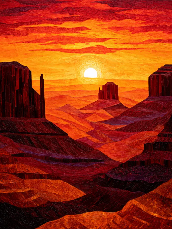 This acrylic painting captures a blazing desert sunset glowing across a vast canyon landscape. The sun rests low on the horizon, shining like a bright white ember surrounded by layers of molten orange and golden sky. Deep red mesas and towering rock formations rise across the scene, their sharp silhouettes cutting through waves of warm color. Rolling canyon ridges stretch into the distance in soft layers of burnt sienna, crimson, and rust. Thick textured brush strokes give the rocks a rugged feel while gentle swirling strokes around the sun create a glowing halo that fills the sky with warmth.