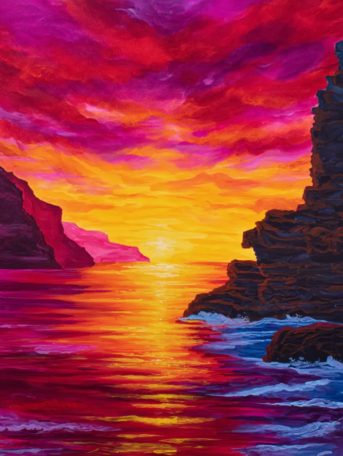 I love coastal sunset paintings like this because they feel bold and expressive from the very first brush stroke. The sky gives so much room to play with color and blend warm shades together. Painting the reflections across the water is especially fun since the brush strokes can stay loose and lively. If you enjoy vibrant sunset palettes and dramatic ocean views, this kind of scene is exciting to paint and the finished piece feels bright and full of energy.
