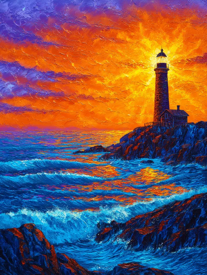 This acrylic painting shows a dramatic lighthouse perched on rugged coastal rocks as a brilliant sunset fills the sky behind it. The clouds glow with intense layers of orange, gold, and warm crimson that spread across the canvas in thick textured brush strokes. The lighthouse rises tall against the glowing sky while waves crash against the rocky shoreline below. Deep blue water rolls toward the rocks with bright reflections of the sunset shimmering across the surface. The contrast between the fiery sky and the cool ocean tones gives the whole painting a bold and striking atmosphere.