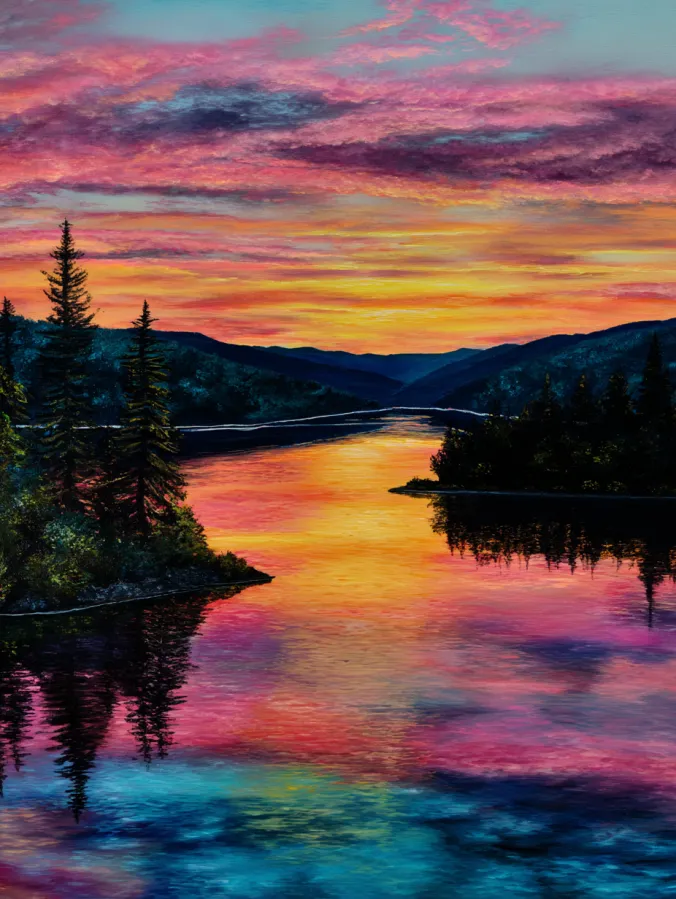 This acrylic painting captures a peaceful mountain lake glowing under a colorful sunset sky. Layers of pink, peach, and golden clouds stretch across the canvas while soft blue sky peeks through the warm tones above. The setting sun lights up the lake like liquid gold, blending into reflections of magenta, violet, and turquoise across the water. Dark evergreen trees stand along the shoreline and frame the scene beautifully. Distant mountain ridges fade into soft shadows in the background, creating depth while smooth brush strokes across the lake mimic gentle ripples reflecting the brilliant sky.