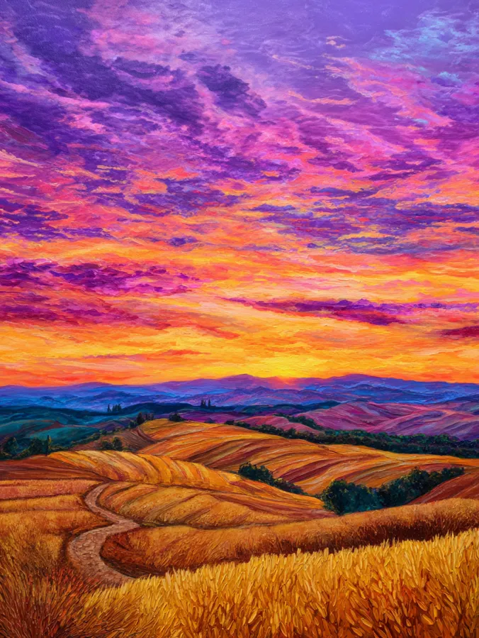 This acrylic painting glows with sweeping countryside beauty and a sky bursting with color. Rolling hills covered in warm golden grasses stretch across the foreground while a winding dirt path gently curves through the fields toward distant mountains. Above the land, the sunset sky steals the show with thick textured clouds glowing in shades of violet, coral, peach, and fiery orange. The brush strokes are lively and layered, giving the clouds a soft swirling movement while the fields are painted with rich strokes that create the look of sunlit wheat waving across the hills. The whole scene feels warm, expansive, and wonderfully alive.