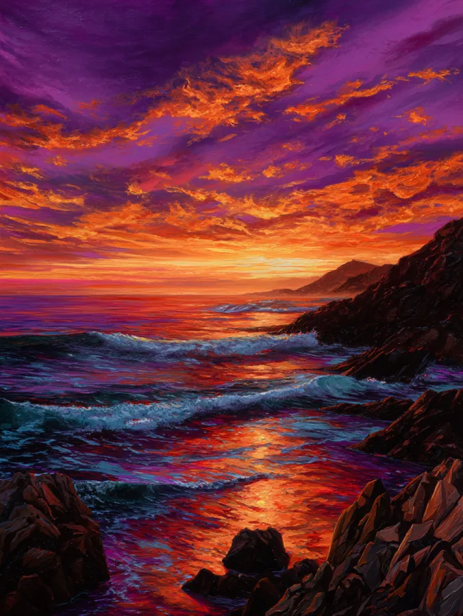 This acrylic painting captures a glowing ocean sunset bursting with rich color and movement. The sky is filled with sweeping clouds painted in vibrant shades of violet, magenta, and blazing orange that stretch across the entire canvas. The sun sinks low along the horizon and spills golden light across the water. Waves roll toward the rocky shore with bold textured brush strokes that give the ocean energy and depth. Dark coastal cliffs frame the scene on both sides while reflections of fiery sunset colors ripple across the water in glowing streaks of coral, purple, and gold.