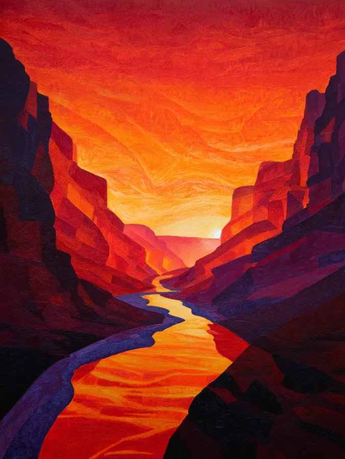 I love how bold and graphic this type of landscape feels when painting it. The canyon shapes are strong and simple, which makes it surprisingly relaxing to block in the large forms first. After that, adding glowing sunset colors to the sky and the river becomes the really fun part. I enjoy watching the warm tones bounce through the scene and slowly build that glowing atmosphere. If you like dramatic scenery and bold color palettes, this one feels creative, satisfying, and very striking once it is finished.