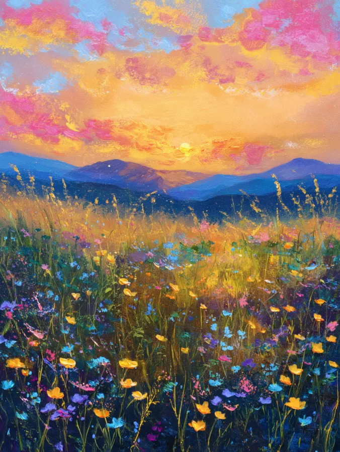 This acrylic painting shows a dreamy wildflower meadow glowing under a soft golden sunset. The foreground bursts with tiny colorful flowers scattered across tall grasses in shades of yellow, pink, lavender, and blue. Loose textured brush strokes give the meadow a lively and slightly whimsical feel as the flowers catch the warm evening light. In the distance, gentle mountain silhouettes stretch across the horizon in calm blue tones. Above them, the sky glows with warm peach, coral, and pastel pink clouds drifting across a soft golden sunset.