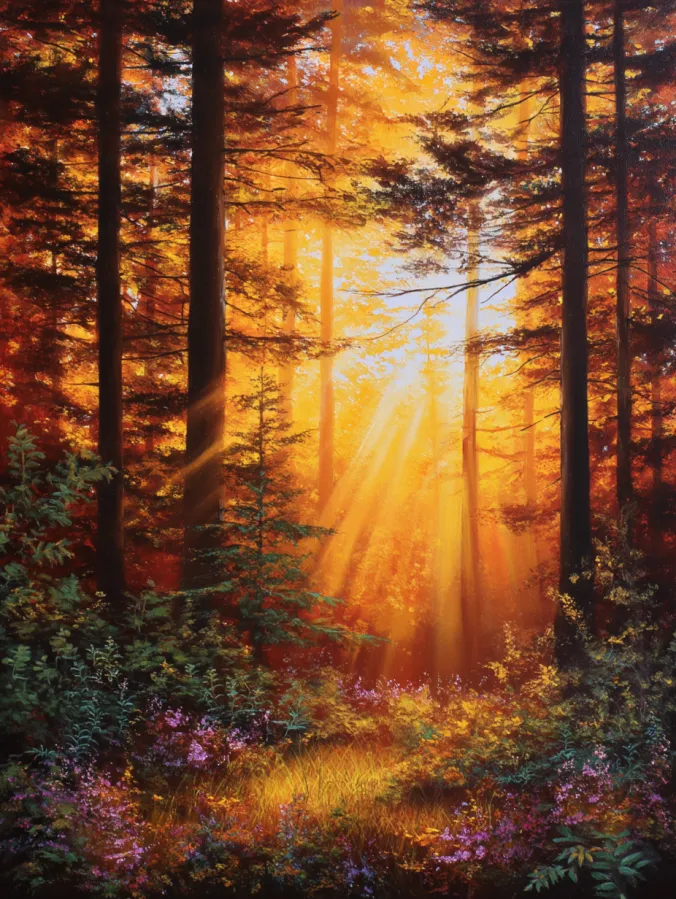 This acrylic painting glows with warm sunset light streaming through a dense forest of tall trees. Dark tree trunks stretch upward across the canvas while golden rays of sunlight burst through the branches and spill across the woodland floor. The center of the scene shines with rich amber and honey colored light that filters through leaves and creates a magical glow between the trees. Soft clusters of wildflowers and green plants scatter across the forest ground while layered brush strokes give the foliage texture and depth. The contrast between the glowing sunlight and the deep forest shadows creates a warm and peaceful atmosphere.