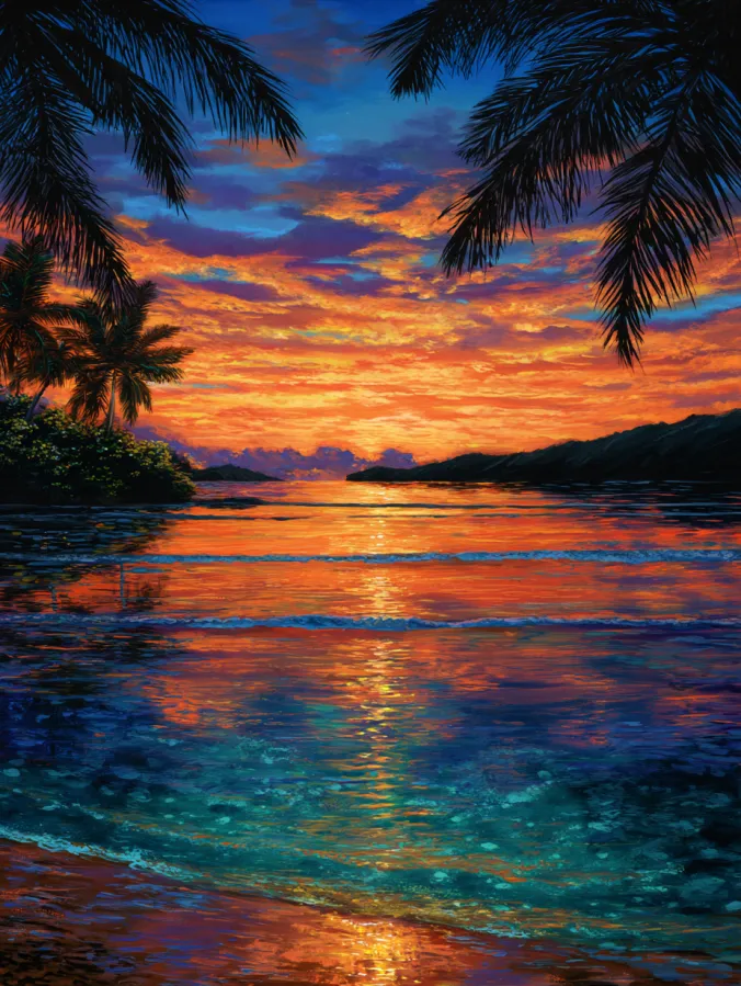 This acrylic painting shows a glowing tropical sunset stretching across a calm lagoon. The sky bursts with warm layers of orange, coral, and soft gold clouds that slowly fade into deeper blues above. Gentle waves ripple across the water and reflect the sunset like a mirror of glowing color. Near the shore the water turns clear turquoise and teal, creating a beautiful contrast against the warm sky reflections. Tall palm trees frame the scene with dark silhouettes that arch inward from the top corners while distant island hills rest quietly along the horizon.