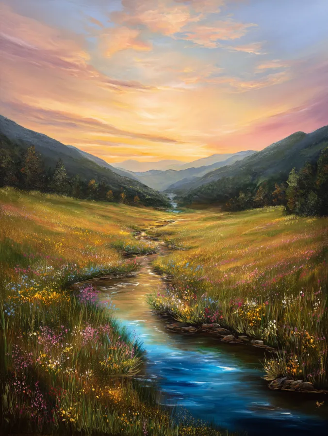 This acrylic painting shows a gentle stream winding through a glowing meadow filled with tiny wildflowers. Warm sunset colors spread across the sky in soft shades of peach, pink, and gold. Layers of distant mountains fade into the horizon and give the scene a dreamy sense of depth. The stream catches the light with rich blues and soft reflections that guide the eye through the landscape. Loose grassy brush strokes create movement across the field while clusters of colorful flowers add cheerful detail throughout the foreground.