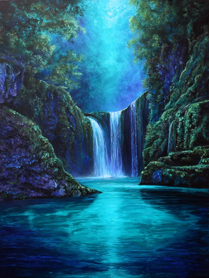 This acrylic painting shows a peaceful waterfall tucked deep inside a lush forest. Smooth streams of water spill over dark rocky cliffs and fall into a glowing turquoise pool below. The surrounding rocks are covered in mossy greens and soft textures that make the whole scene feel cool and refreshing. Tall trees frame the waterfall and their leafy branches stretch overhead, allowing gentle beams of light to glow through the mist. The water reflects shades of teal and blue that ripple softly across the surface and bring a calming rhythm to the composition.