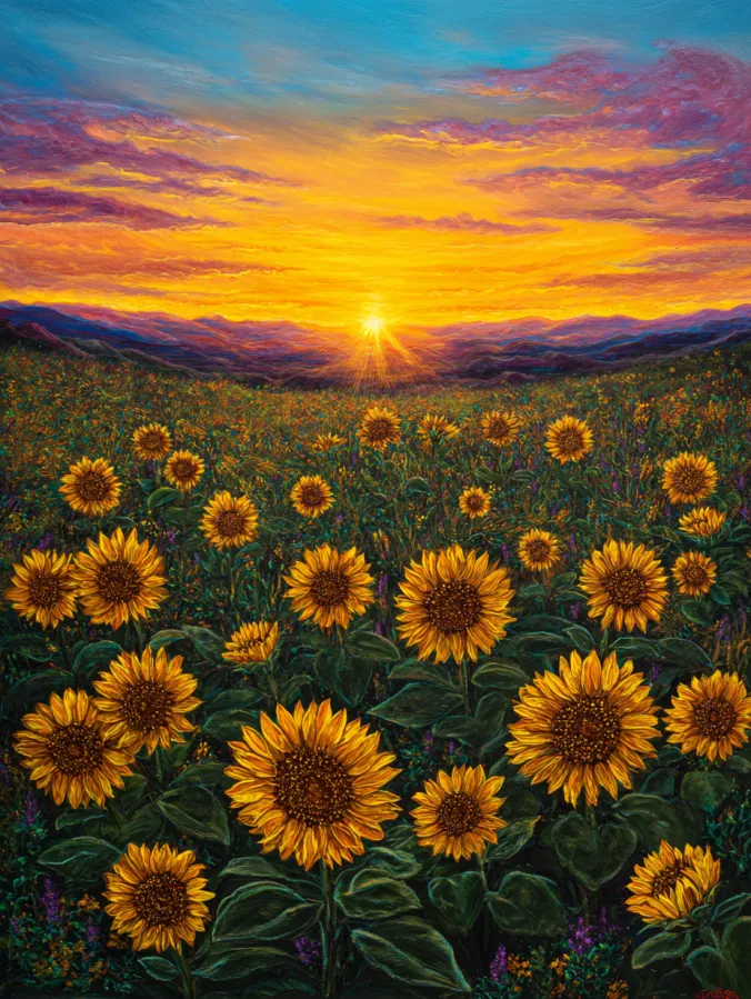 This acrylic painting shows a wide field of bright sunflowers stretching toward a glowing sunset. Large golden blooms fill the foreground and their rich yellow petals stand out beautifully against deep green leaves. The flowers gradually grow smaller as they move toward the horizon and create a lovely sense of depth across the field. In the distance, soft mountain ridges frame the scene while the sky explodes with warm sunset colors. Brilliant shades of orange, gold, pink, and soft purple blend across the clouds and lead the eye straight to the glowing sun sitting low on the horizon.