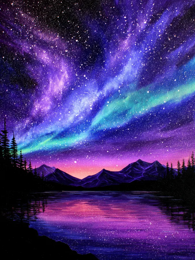 This acrylic painting shows a breathtaking night sky glowing with sweeping ribbons of northern lights. Brilliant shades of violet, indigo, and turquoise stretch across the sky and blend into soft hints of pink near the horizon. Hundreds of tiny stars sparkle across the dark sky and add beautiful texture to the scene. Below the sky, a calm lake mirrors those glowing colors across its surface. Dark mountain peaks and tall pine trees form quiet silhouettes along the horizon and create a peaceful frame around the glowing reflection in the water.