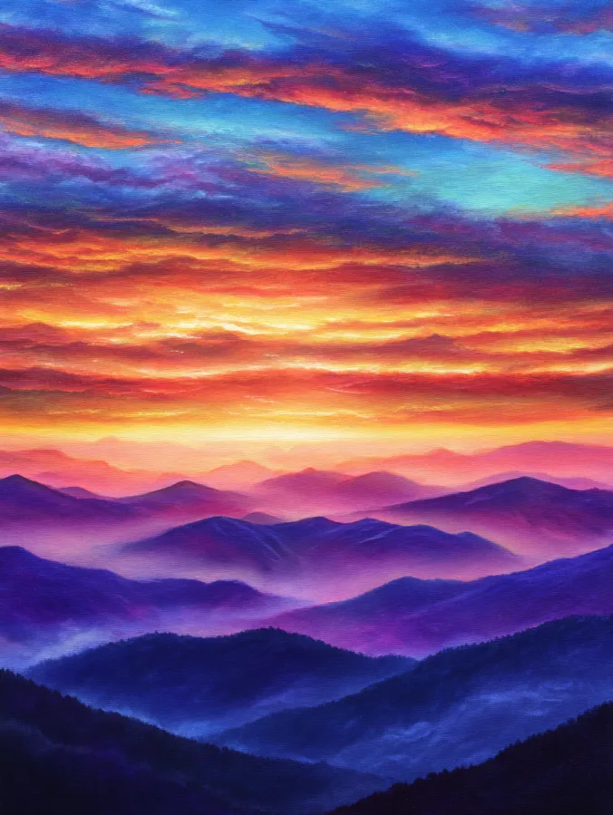 This acrylic painting shows a sweeping view of layered mountain ridges fading softly into the distance. Deep blue and violet hills stack gently across the landscape while soft mist drifts between the valleys. Above the mountains, the sky bursts with glowing sunset colors. Rich oranges, warm golds, coral pinks, and touches of turquoise spread across the clouds in broad textured strokes. The bright horizon creates a beautiful contrast against the cooler mountain tones and pulls the whole composition toward the glowing center of the sky.