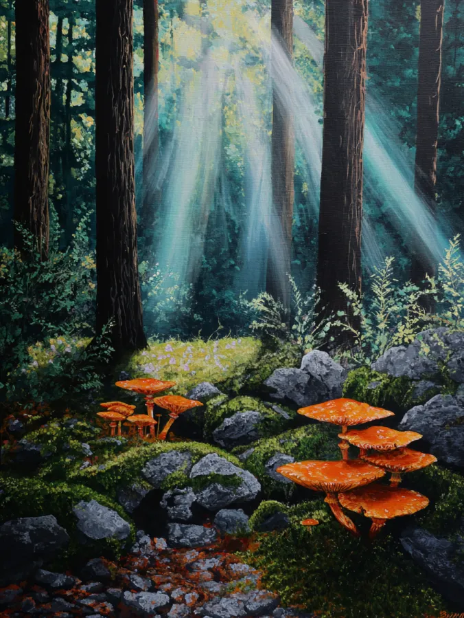 This acrylic painting shows a quiet woodland scene where tall trees rise into a glowing canopy above. Soft beams of sunlight stream through the forest and illuminate patches of moss, rocks, and leafy plants below. The forest floor is rich with deep greens and earthy tones while bright orange mushrooms stand out beautifully among the mossy stones. Light and shadow move across the ground and give the whole scene a peaceful sense of depth. The tall tree trunks frame the composition while the glowing light in the background gently draws the eye through the forest.