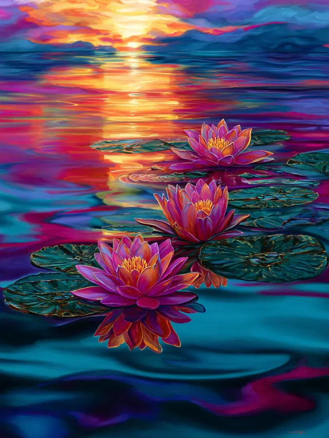 I love painting scenes like this because the water reflections are incredibly satisfying to create. Blending all those bright sunset colors across the surface feels playful and relaxing at the same time. The lilies are also a joy to paint since each flower slowly opens with layered petals that pop against the darker water. Watching the reflections and colors build across the canvas feels almost hypnotic in the best way. It becomes one of those paintings where the whole process feels calm, colorful, and wonderfully creative.
