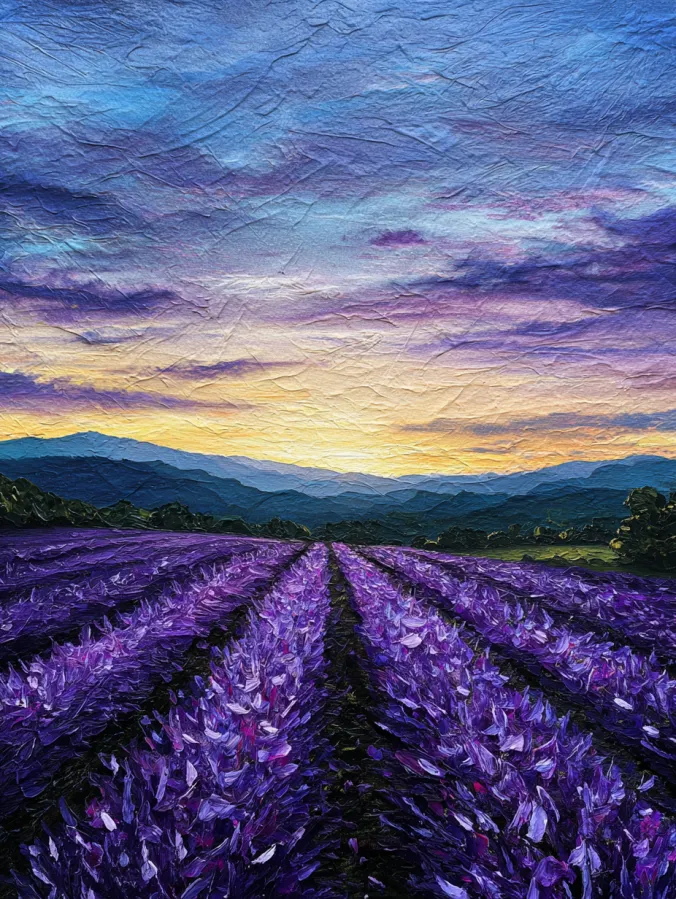 This acrylic painting captures long rows of blooming lavender stretching toward distant blue mountains. Rich purple tones fill the foreground and create strong perspective lines that guide the eye toward the horizon. The flowers are painted with textured brush strokes that give the field a soft, fluffy look. Above the landscape, the sky glows with dreamy shades of gold, peach, lavender, and deep blue. Gentle cloud layers spread across the canvas and add beautiful contrast to the vibrant field below. The whole scene feels wide open and peaceful, like standing in a quiet countryside just as the sun begins to set.
