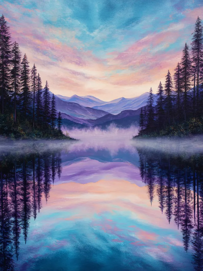 This acrylic painting shows a calm mountain lake surrounded by tall pine trees and layered mountain peaks in the distance. The sky glows with soft pastel shades of turquoise, peach, lavender, and pink that gently blend together across the canvas. Those dreamy colors reflect perfectly across the glassy water below and create a beautiful mirror effect that fills the whole scene. Thin silhouettes of pine trees frame the lake on both sides and add contrast against the glowing sky. Light mist floats across the surface of the water and gives the landscape a quiet early morning feeling.