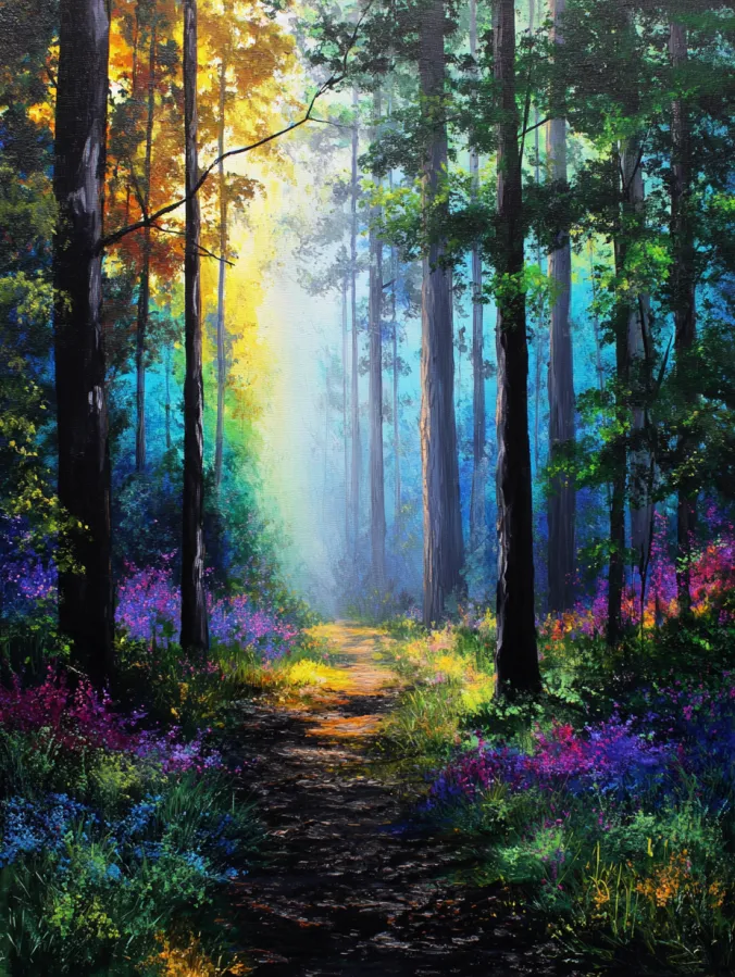 This acrylic painting shows a quiet forest path winding gently through tall trees and colorful wildflowers. Warm sunlight filters through the branches and creates glowing beams that stretch across the scene. Deep greens and rich browns shape the tree trunks while vibrant pops of purple, pink, and golden flowers brighten the forest floor. Soft mist lingers in the distance and gives the path a dreamy sense of depth as it disappears into the glowing light. The brush strokes feel lively and textured, especially in the foliage where layers of color bring the woodland setting to life.