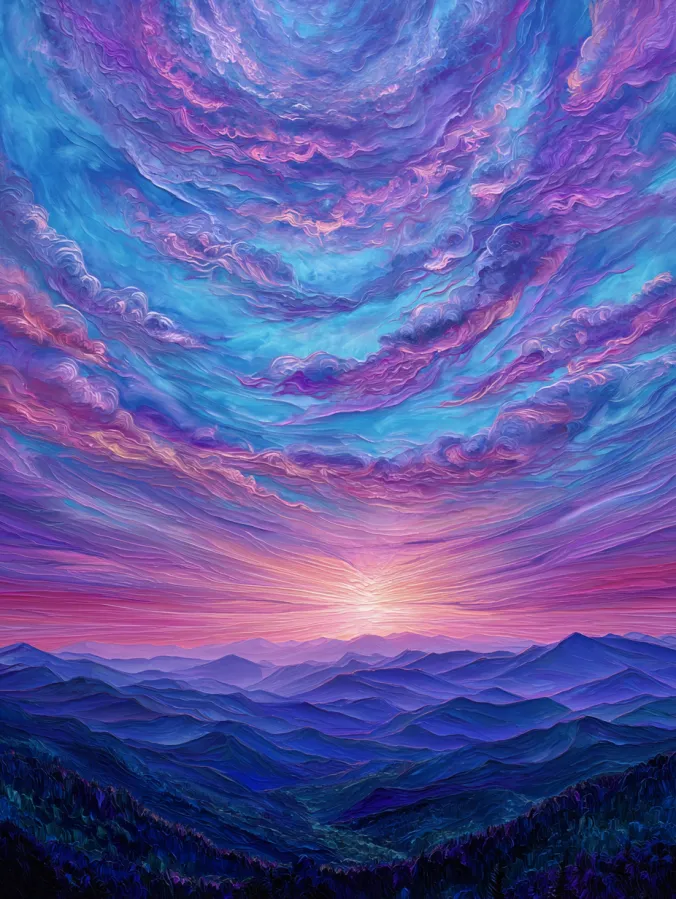 This acrylic painting captures a breathtaking sunrise spreading across layers of distant mountains. Soft purple and deep blue ridges stretch across the landscape and slowly fade into the horizon. Above them, the sky becomes the real star of the scene. Waves of swirling clouds fill the canvas with flowing shapes in shades of turquoise, lavender, pink, and glowing peach. The rising sun sits at the center and casts warm light across the clouds and valleys below. Smooth blended colors and curved brush strokes create movement in the sky while the mountains stay calm and steady underneath.