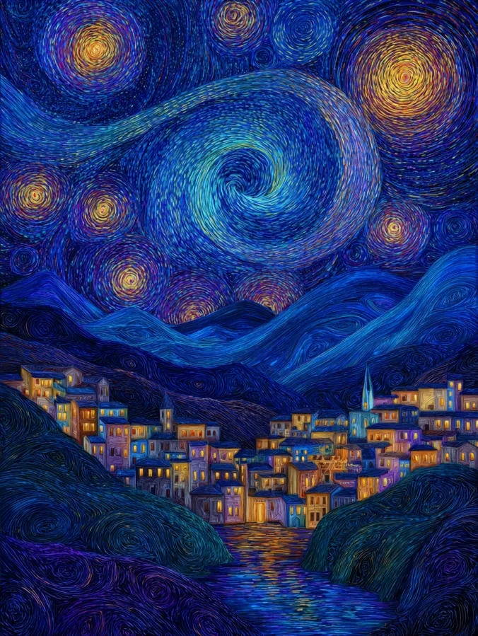 This acrylic painting shows a charming little village tucked between rolling hills under a magical night sky. Deep shades of cobalt and indigo fill the landscape while glowing windows scatter warm golden light across the homes. Above the village, the sky swirls with bright stars and glowing spirals of color that stretch across the canvas. Rich blues, purples, and hints of turquoise blend together in curved brush strokes that create beautiful movement overhead. The distant mountains and the quiet river below reflect the glowing lights and tie the whole dreamy scene together.